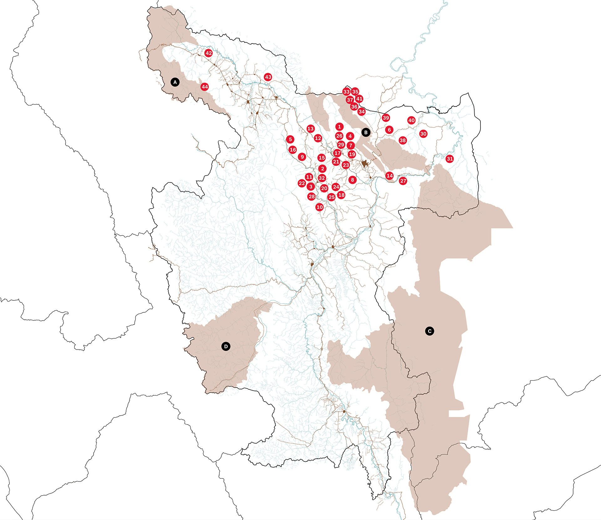 How to reflect on indigenous societies from an architectural perspective, from the standpoint of urbanism and planning, without designing buildings or infrastructure? In Amazonia these practices have been historically linked to exploitation processes and the destruction of natural assets. Could it be possible to link them instead to educational and health processes that benefit the different communities? How to dilute the impact of colonisation, which has ravaged the structure of Amazon societies? How to ensure the continuous exchange of specific forest lore? How to extinguish the passivity of dualistic visions, in order to further social, economic, political, ecological, educational and health interactions? How to stop reducing and isolating the indigenous, mestizo and migrant realities, among others, which are integrated in daily life, through sustainable alliances with dynamic identities? How to stop dividing sources of knowledge and, even worse, erasing the creators of these infinite cultures of care? How to stop building borders to control and nurture territories that have their own regeneration rhythms? How to imagine a diverse future, assuming there are mutual aid networks already in place, ones which respect differences? What are the specificities of these social networks, their dialogues, the configurations of their lore? How to mobilise interweaving methodologies between disciplines in order to repair, together, inhabiting every scale? How can we avoid remaining numb when faced with the dimensions of the problem, with inequality diagnostics, with the homogeneous reality brought by semistructured surveys, in order to cross the threshold of pain and be able to think/do from a place of strength, partaking in the collective creativity that is spread out in the territories? How to avoid getting stuck in tragedy and sensationalism, how can we overcome violence and collective trauma? How can we dodge the entertainment provided by an exoticisation of knowledge? How can we contextualise the necessary adjustments for the future, in tune with the social organisation? How can we support this change? Is it possible to do it together?
